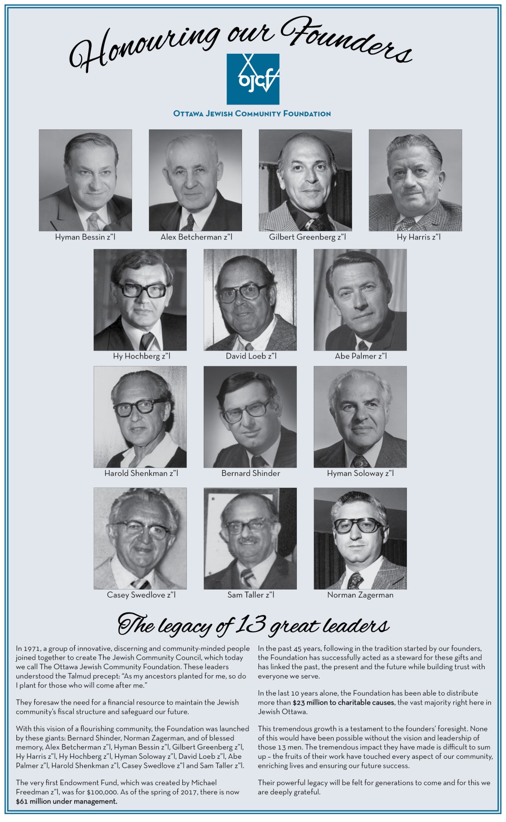 The Ottawa Jewish Community Foundation was founded in 1971. Far-sighted community members Bernard Shinder, Gilbert Greenberg, the Jewish Federation of Ottawa (formerly known as the Vaad Ha’Ir) and Executive Director Hy Hochberg foresaw the need for a financial resource to maintain the Jewish community’s fiscal structure and safeguard its future.
