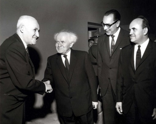 Above is a photo of Israel’s Prime Minister David Ben Gurion visiting the Ottawa Jewish Community Centre Left to Right: Alex Betcherman, David Ben Gurion, Lawrence Freiman and Bertram Loeb May 1961.